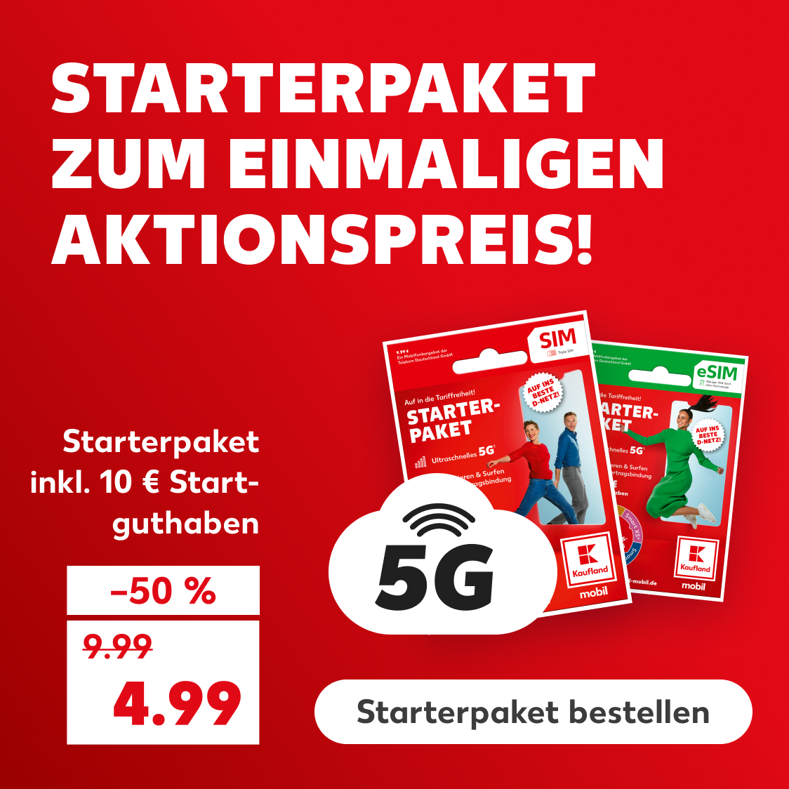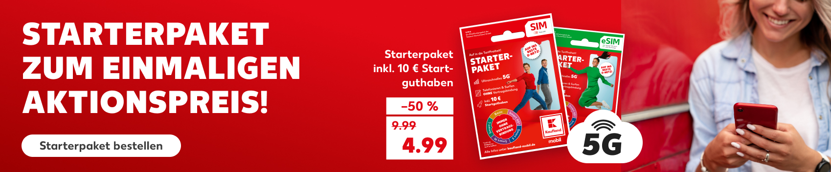 - 1Starterpaket für nur 4.99 €¹ als SIM oder eSIM bestellen.