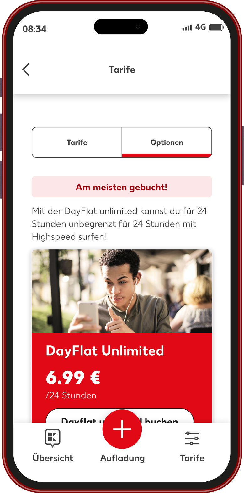 Gehe in der KAUFLAND MOBIL App auf “Tarife”. Anschließend klickst du auf den Reiter “Optionen”